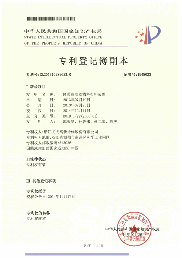 降膜蒸發器物料布料裝置 受讓專利登記簿